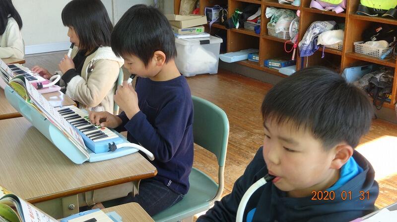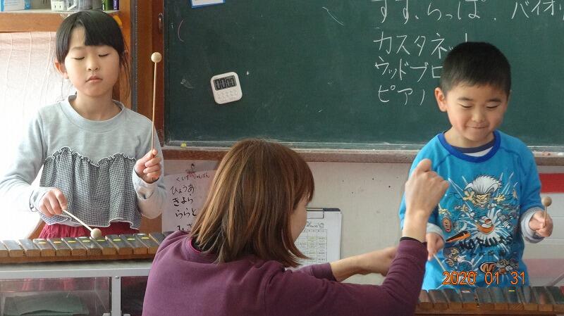1・2年生は、合同で音楽の授業を行っています。今日は、2年生は鍵盤ハーモニカを使って演奏したり1年生はそれに合わせて歌っていました。また、木琴をつかったり小太鼓を叩いたりとみんな楽しそうに演奏していました。