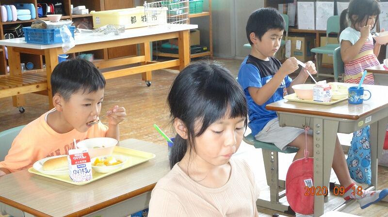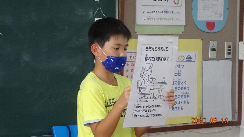 今週は食育週間です。そこで、「いただきます」の前に保健体育委員会の児童が各教室で指導を行っています。今回は、姿勢について「きちんと座って食べていますか」についてです。今は、会話を楽しみながらとはなかなかいきませんがみんな美味しそうに給食を食べています。