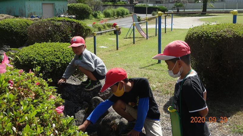 季節は秋。2年生が秋を感じるものを見つけていました。これから、だんだんと秋が深まり校庭の木々も紅葉していきます。季節の変わり目を感じる今日この頃です。