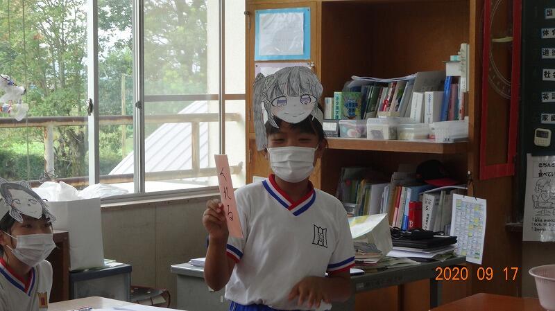 5・6年生が国語の授業で尊敬語について学習していました。一人一人がキャラクターのお面をかぶり他の人になり、その人にどのように言葉掛けをしたらよいか実際に呼びかけながら学習していました。正しい言葉違いなかなか難しいです。