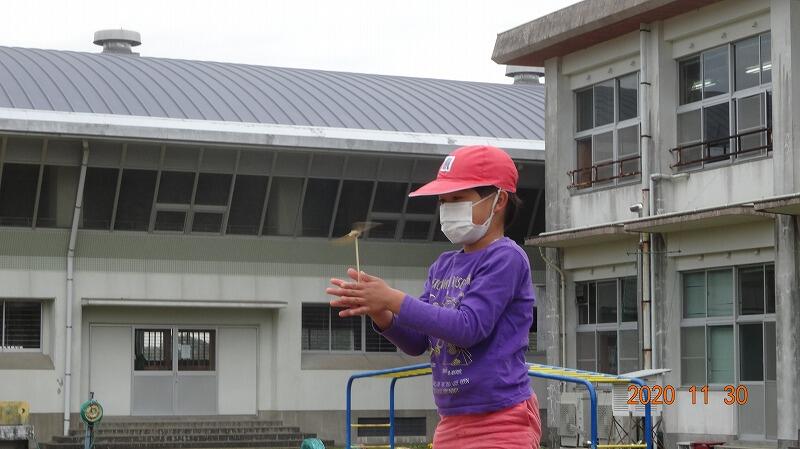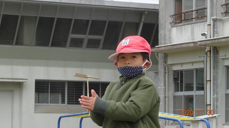 地域の方から児童全員に竹とんぼをいただきました。そこで、1年生は生活科の時間を使って竹とんぼで遊びました。始めはなかなか上手に飛ばすことが出来ませんでしたが、だんだんと上手に飛ばすことができるようになりました。やっぱり何事も経験が重要です。今回もそうでしたが、学校は地域の皆様に支えてもらい様々な活動を行っていくことができます。本当に感謝しております。