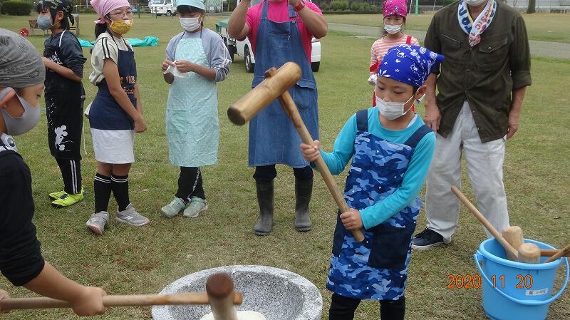雨が心配されましたが、曇り空から少しずつ太陽も顔を出してくれ餅つきを行うことができました。米作りの最終目標である餅つき。地域の皆様や保護者の方々の協力を得て楽しいひとときを過ごすことができました。コロナウイルス感染症対策のために、学校でつきたてのお餅を食べることは出来ませんでした。持って帰って家族みんなでお召し上がりください。