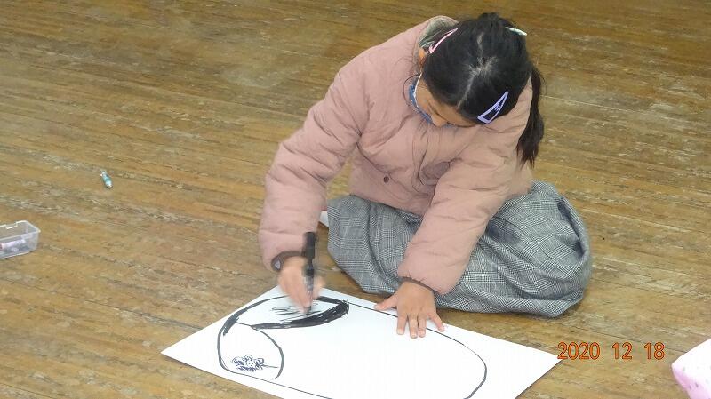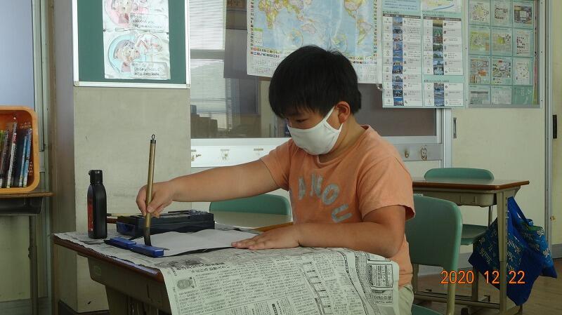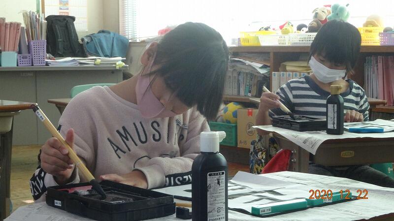 3年生が習字を行っていました。書いている文字は、「正月」です。学校で、習字の学習が始まるのは3年生からですので、なかなか筆を上手に使いこなすのが難しい児童もみられます。でも、全員一文字一文字ていねいに書いていました。