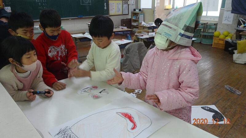 2年生は、生活科で福笑いを自分たちで作って遊んでいました。画用紙いっぱいに大きな顔を描いて、目・鼻・口などを用意しました。顔の部位を置いていくだけの簡単な作業ですが、出来上がりをみると何となく笑ってしまいます。冬休みに、家庭で作って家族みんなでやってみるのもいいですね。