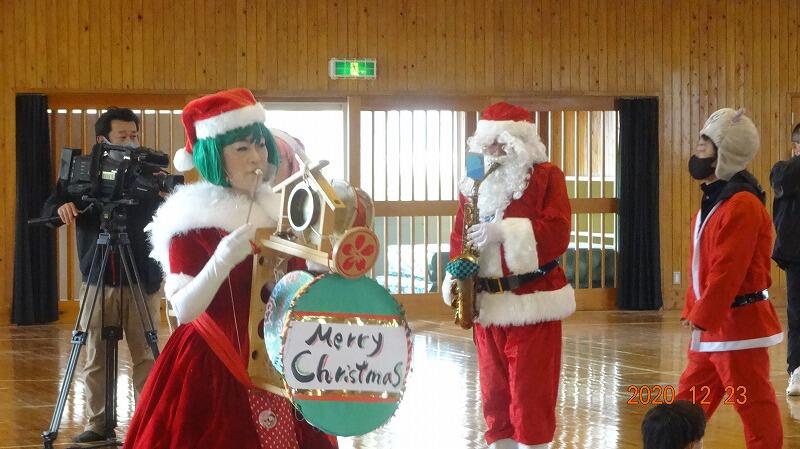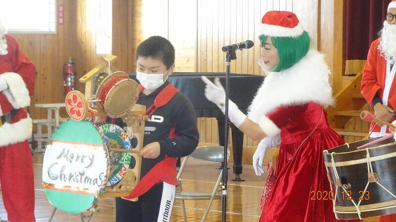 山之口商工会からマスクをいただくことになり、今日贈呈式を行いました。贈呈式の中で、子ども達が喜ぶようにと「宮田わかなさん率いる宮崎花ふぶき一座」に来て頂きました。クリスマスソングを中心に演奏したりお話を聞いたりしました。途中代表児童に、楽器を持たせてもらい演奏しながら体育館を一周したりして楽しい時間を過ごすことができました。