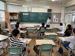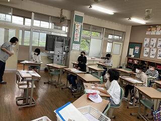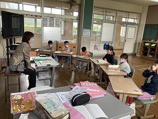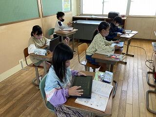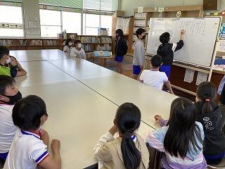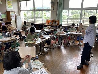 今日の5時間目は、1年生が国語でしりとりを行っていました。2年生は、図書室で読書、3年生は、理科でキャベツのお世話、4年生も理科で虫取り、5・6年生は、図工で花のスケッチをしていました。
