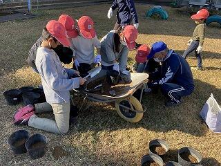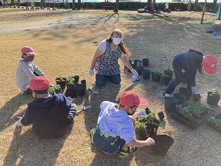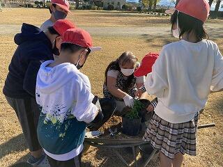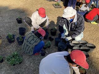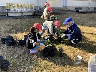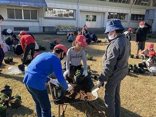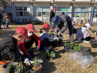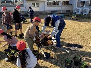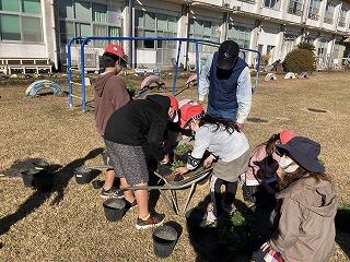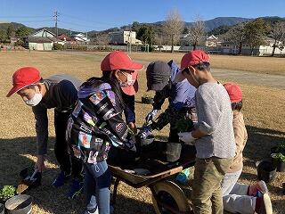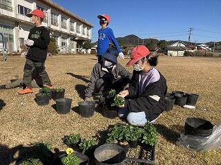 卒業式に飾る花として1人5鉢運動で花の苗の定植を行いました。地域のボランティアの方6名にも手伝ってもらって植えました。