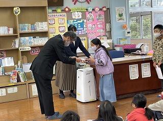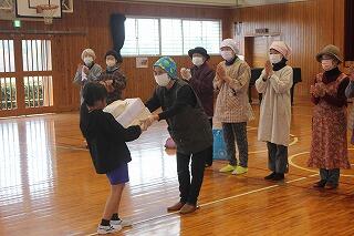 その後、日之出の会(麓敬老会)からマスクと消毒液の贈呈がありました。