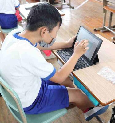 3年生がタブレットを持ち、花壇の植物を撮影しています。理科の時間に植えた「ホウセンカ」です。生長を記録しています。上から、横から、下からと、まるで生物学者のように熱心に撮影していました。次に観察する時は、新たな気づきがあるでしょう。