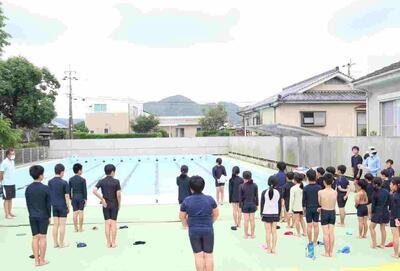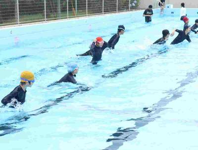 プール学習がスタートしました。今日は全校児童一緒にプール開きを行いました。プール学習の目的や安全に気を付けることを確認した後、「宝さがし」「流れるプール」でみんな大盛り上がりでした。子どもたちは、プール学習をとても楽しみにしていたようです。