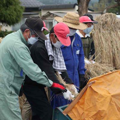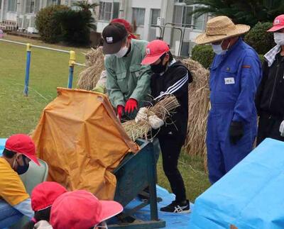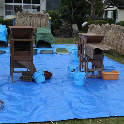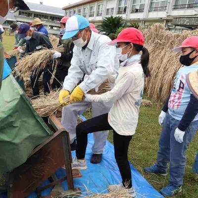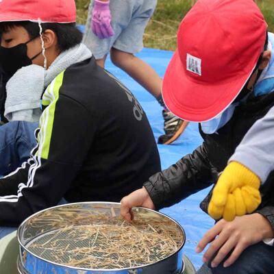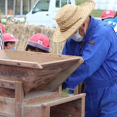 雨を心配しましたが、無事に脱穀を終えることができました。たくさんの地域協力者の方々にお越しいただき、昔ながらの脱穀の方法を教えていただきました。足踏み脱穀機と唐箕を使って、稲から籾をはずしました。脱穀機を踏むこと、唐箕では取っ手を回すこと、1つ1つの作業に力が必要で時間もかかります。昔の人々の苦労を感じ、命の大切さを学びました。収穫したもち米は、124.8㎏でした。11月17日にはもちつき大会が行われます。楽しみです。地域協力者の皆様、本当にありがとうございました。