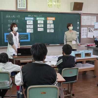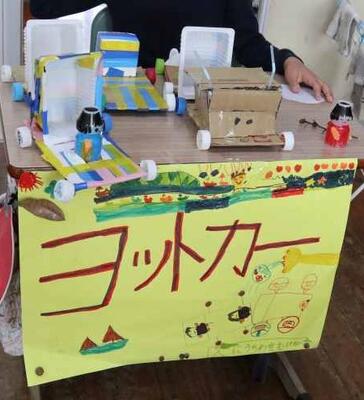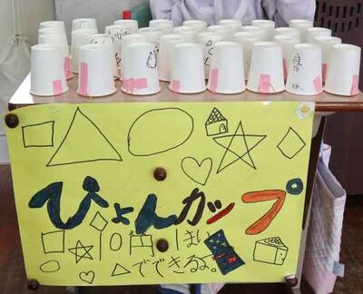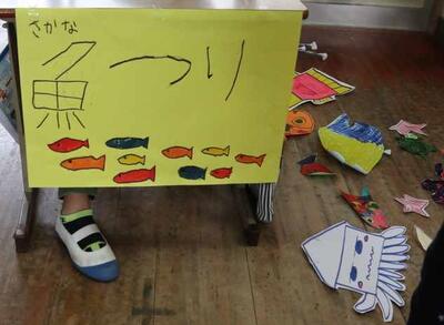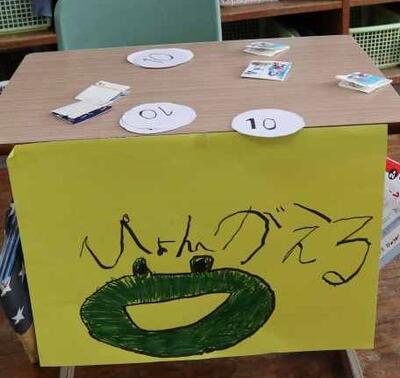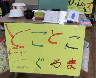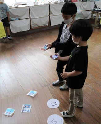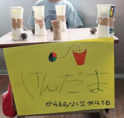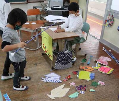 3・4時間目に2年生教室から「いらっしゃいませ~!」と威勢のいい声が聞こえてきました。1年生を招き、手作りおもちゃの「おもちゃ祭り」の時間でした。値段が設定され、紙で作ったお金を払います。お店屋さん役の2年生が1年生に遊び方を説明している姿は、頼もしくありました。2年生も1年生も時間いっぱい楽しんでいました。