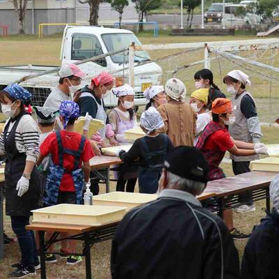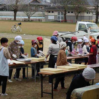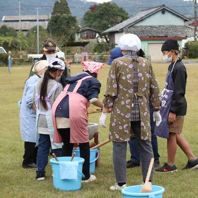 田植え、稲刈り、脱穀を行い、収穫したもち米でもちつき大会が行われました。収穫したもち米は83.4㎏でした。今日もたくさんの協力者の方々に来ていただきました。総勢30名です。地域の方、保護者の方の麓小を支えて下さる温かいお心づかいに感謝の気持ちでいっぱいです。炊きあがったばかりのもち米を味見して、ほっこり笑顔の子。「早くしないと餅が固まっちゃうよ」と急いで丸める子。たくさんできたお餅に満面の笑みの子。子どもたちの嬉しそうな顔を優しく見つめる協力者の方々。「今日は幸せな日だな~」とつぶやく子がいましたが、本当に、みんなが楽しいひとときを過ごすことができました。美味しいお米を育み、温かく支えて下さる人々が住む、麓地区への愛が、さらに増した麓っ子でした。たくさんのお力添えを本当にありがとうございました。