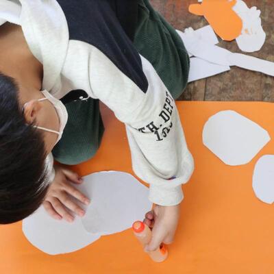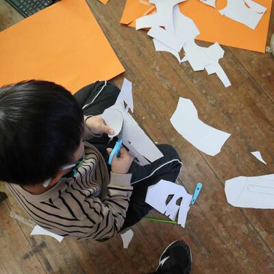 1,2年生は図工で紙版画を作っています。刷り上がりはどんな感じになるでしょう。紙で作った身体や道具のパーツの向きをどうしようかと熟考していますよ。インクをつけて、刷る時が楽しみですね。