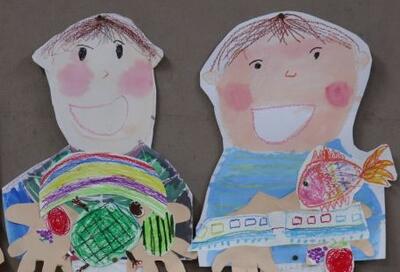1・2年生が図工の時間に、自分の顔と手のひらの上に好きな物を描きました。上手に描けていて、とっても可愛らしいです。保護者の皆様は、4月参観日で是非、実物をご覧ください。