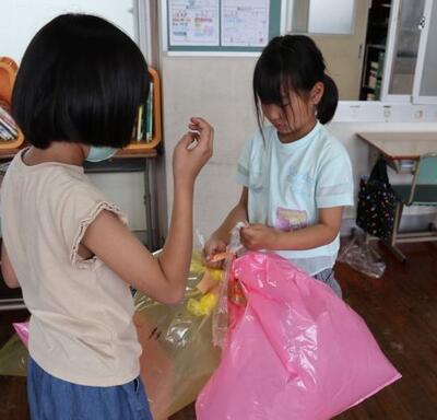 3・4年生は色のついた袋をつなげたり、絵を描いたりして、袋の風船のつみきを作りました。大きな袋にどんな絵を描こう、どうやってつなげようかと、夢中で作っていました。できた作品を運動場の鉄棒やジャングルジムに飾ったり、持って走ったりして完成を楽しみました。