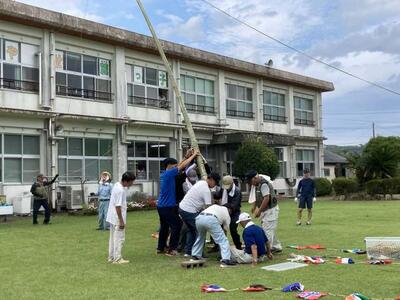 今年も保護者・地域の皆様の協力により、運動会の準備を行うことができました。表示設置、入退場門の設置、万国旗等、たくさんの方々のお力添えで作業が進みました。万国旗を揚げる時には、保護者と地域の方が力を合わせて、竹を持ち上げました。圧巻です。準備の後に、校庭に遊びに来た子どもたちが、青空にはためく旗を見上げてうれしそうにしていました。運動会への気持ちが高まっているのでしょうね。保護者・地域の皆様、本当にありがとうございました。