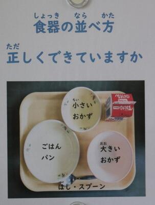 今週は食育週間です。給食担当の先生が、食器の並べ方について放送で話をしました。放送を聞きながら、お盆の上の食器の並びはどうかな?と自分のお盆を見ている子もいました。食について考えることは、自分の身体や命を育むことにつながりますね。