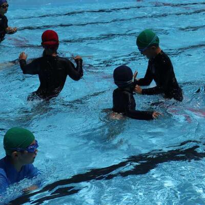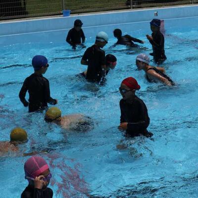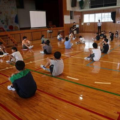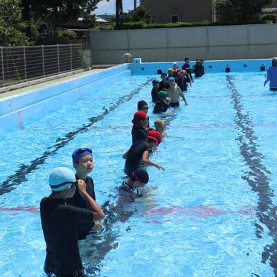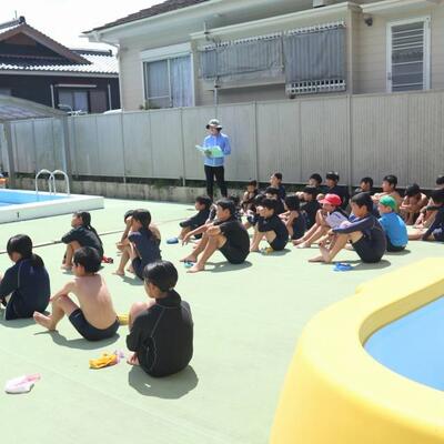 プール開きが行われました。命を守るためにプールでの約束についてしっかりと話を聞いた後、いよいよプールに入りました。今日は全校児童で行いました。水中じゃんけんや宝さがしなど楽しい活動でした。小学校のプールが初めての1年生も歓声を上げてプールを楽しみました。