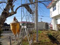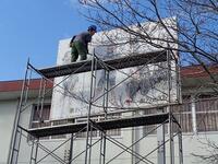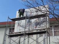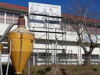 施工は、前回の工事をしていただいた高城町のあんどう工房さんにお願いしました。足場を組んで1日がかりの作業になりました。看板の貼り替えが終わり、遠くからでも「子ども芸能保存会と弥五郎どん祭り」のことが目立つような看板になりました。地域の方も喜ばれると思います。