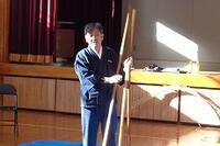 学習では、弓づくりの作業の説明があり、実際に竹を割るところ、竹の曲がりをつくるためのくさび打ちの作業を見せていただきました。その後、児童は、質問に答えてもらい、かんなで竹削りの体験、弓をひく体験に挑戦しました。3.4年生の学習でしたが、1.2年生や5.6年生も参加して、全校での学習になりました。