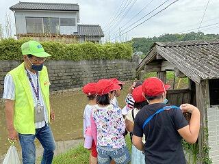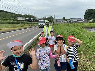 6月17日 1年生が生活科の時間に「みんなで通学路を歩こう」という内容で、学校周辺の探検を行いました。今回は、学習支援ボランティアの方にも参加していただき、地域の方ならではの視点で説明等もしていただきました。