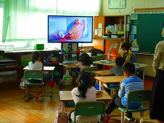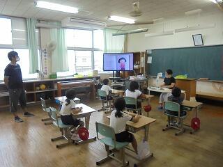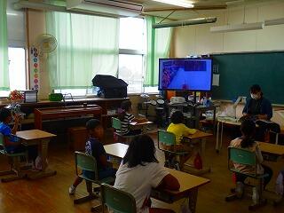 6月26日 朝の活動の時間にボランティア「やまばと」の方による読み聞かせが行われました。コロナウィルス感染拡大防止のため、ずっと延期になっていたため、子どもたちもとても楽しみにしていました。「三密」を避けるために、書画カメラを使い、本を拡大して行いました。