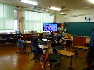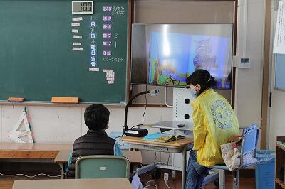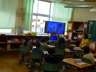 子どもたちは、大型テレビの画面に映る絵本を見ながら朗読の声に聞き入っていました。