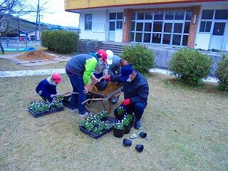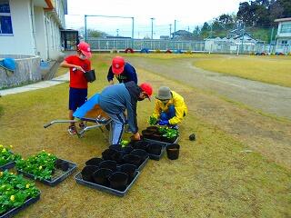 12月4日 卒業式に向けての花の植え替えをグリーン活動で行いました。5年生に加え、学習支援ボランティアの方々にもご協力いただき、パンジーやビオラ、キンセンカの苗、400鉢を植え替えました。卒業式に向けて、これから大切にお世話をしていきます
