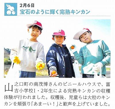都城市広報誌が学校に届きました。表紙をあけると富っ子の笑顔に目を奪われました。2月6日に実施された『1・2年生 きんかんちぎり』の記事が掲載されていました。地域の方が大切に育てたきんかんは、宝石のように輝くあま~いものでした。山之口の素晴らしい地域の宝に触れた子どもたちでした。