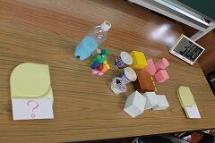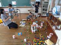 1.2年生が図工の学習をしていました。教室には、ペットボトルのキャップ、牛乳パックの空き箱がたくさん用意されています。学習の単元名は、「ならべてみつけて」です。子ども達は、数名ずつグループに分かれて、材料をならべたり、箱につめたり、集めて寄せたりして遊び始めました。積み木を重ねたり、ドミノ倒しのように並べたりして楽しく学習できました。