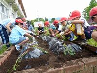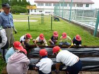 生活科の時間に1.2年生がさつまいもの苗植えをしました。植え方のご指導をしてくださるのは、地域の紺家さんです。毎年いも畑のマルチ張りから苗の植え方まで指導してくださっています。