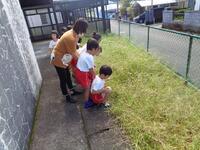 春に植え付けたさつまいもの苗が大きく成長し、収穫の季節を迎えました。校舎横の栽培園は、回りを囲んでいるブロックが見えないぐらいにさつまいものつるが伸びていました。