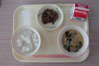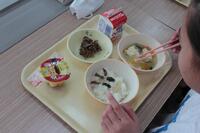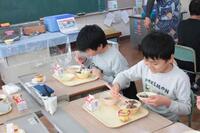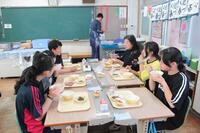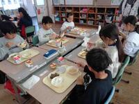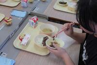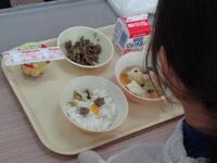 5.6年生は、どんぶりの試作や試食をしているので、今日の給食の具材を使って、弥五郎どんぶりになるように、白ご飯の上の盛り付けを工夫していました。具材の置き方を考えながら配置して、それから食べるのもいつもと違っていいなと感じました。