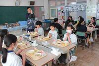 給食に、弥五郎どんぶりが出ました。給食センターの方の工夫とアレンジで「弥五郎丼の牛肉」というメニューで提供されました。白ご飯の上に牛肉をのせて牛丼にしてから食べます。5.6年生の総合的な学習の時間の学習支援でお世話になっている新美潤子様にも来ていただいて、一緒に召し上がっていただきました。