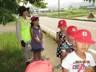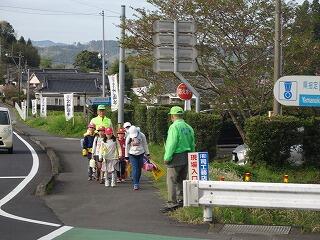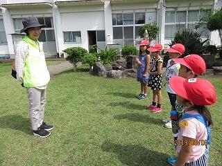 6月6日 1年生が学校の周りを歩きながら、自分たちの通学路の安全を守っている人々や施設について学習しました。また、登下校時のルールやマナーについても学習しました。学習支援ボランティアの方も一緒に歩いてくださり、安全面等で見守っていただきました。
