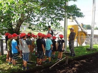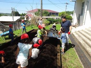 5月21日 学習支援ボランティアの協力を得て、2・3年生がいもの苗植えをしました。今回は、畝作りやマルチ張りから行い、準備が整うと、苗の植え方を教えていただき、自分たちで草取りをした畑に一人一人ていねいに苗を植えていきました。10月の収穫が楽しみです。