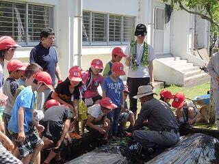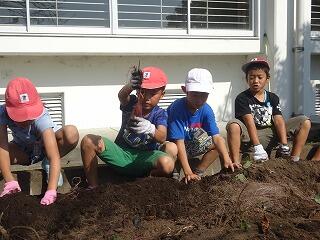 10月16日 2・3年生が、農業体験活動としてサツマイモの収穫を行いました。支援ボランティアの方に収穫の仕方を教えてもらい、収穫が始まるとあちらこちらから大きな歓声が聞こえてきました。1学期に植えた苗が大きな実をつけており、大喜びの子ども達でした。今年の収穫量は約190個でした。