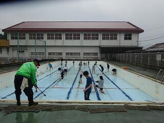 5月31日 夏の水泳の授業に向けて、プール清掃を行いました。3年生から6年生の児童が参加し、デッキブラシでごしごしと磨きました。また、支援ボランティアの方々も来てくださり、一緒に作業をしていただきました。