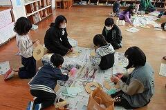 5・6年生が図工の学習でオリジナルの物語をつくりました。読者のターゲットを1年生とし、実際に読んであげて喜ばせたいというねらいのもと作成しました。今回は、4つのグループに分かれてできあがった紙芝居を読んであげる活動を紹介します。4つのグループが作成した紙芝居の題名は『みらいからやってきた こじエモンとタツ!』、『チョコポールのぎゃくしゅう~おかしを大事に~』、『家族のきずな』、『おにぎり物語~おかずは何がいい~?』になります。帰りの会の時間を利用して読み聞かせをしました。1年生は、5・6年生が作った話を興味津々な様子で聞いていました。5・6年生もこれまでに班ごとに読む練習を行い、どの班も読み終えた後には、達成感が満ちあふれていました。最後に、1年生から「ありがとうございました。」と心のこもった言葉がかけられていました。