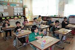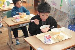 12月7日(木)の給食は、 メニュー【さつまいもたっぷり豚汁、千切り大根の卵とじ、ごはん、牛乳】でした。さつまいもたっぷり豚汁に入っている『さつまいも』は、1・2年生が生活科で今年5月に植えて栽培したさつまいもでした。先日給食センターの見学で近いうちに給食の食材として使うことを教えていただいたので、子どもたちはいつ出てくるのか楽しみにしていました。1・2年生の教室をのぞいてみますと子どもたちは美味しいと言いながら食べていました。