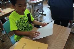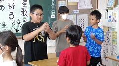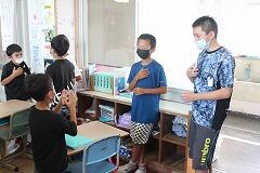 3・4年生総合的な学習の時間『みんなが幸せな世の中に』で、ユニバーサルデザインについての理解や視覚障がい者の方とのふれあいなどの学習を通して、「障がいがある人もない人も みんな同じように生きている。」ということに気付けました。そして、聴覚障がい者の方の学習で手話についても学びました。3・4年生は、全校で歌っている『地球星歌』の一部を手話で歌えるようになりました。そこで今日は、5・6年生に対してできるようになった手話を教え、一緒に歌ってみようという活動を行いました。画像は2~4人グループで3・4年生から教える活動の様子です。最後は、みんなで一緒に手話による『地球星歌』を合唱しました。