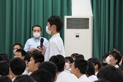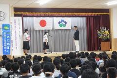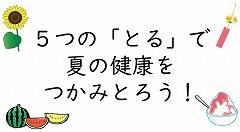 次に、養護教諭の先生から7月の目標『夏の病気を防ぎましょう』について、5つの「とる」で夏の健康をつかみとる話がありました。『5つのとる』とは、①朝ごはんをとる、②すいみんをとる、③りょう(涼)をとる、④すいぶんをとる、⑤じょうほうをとる、になります。⑤情報をとるとは、保健室の前に毎日掲示されている「暑さ指数(WBGT)」を見て、自分の行動を考えてほしいということでした。最後に、5月に行われた新体力テストで最高のA判定であった7名に判定書を渡し、これからも元気な体をめざして生活することを確認しました。