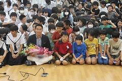 小学5・6年生と中学生を対象とした山之口地区まちづくり協議会主催による競泳オリンピックメダリスト松田丈志さんの講演会が開催されました。演題は『自分超え ~強くなるために大切にしてきたこと~』でした。初めにこれまでの松田丈志さんの競泳人生を映像で振り返り、アテネ五輪から4大会の中で演題にある強くなるために大切にしてきたことをエピソードとともに話してくださりました。ロンドン五輪で獲得した銀メダルを子どもたちは一人一人手に取りながら見ることができました。小学生にとっては、目標を設定するエピソードのところが強く印象に残ったと感じました。また、中学生にとっては、結果が上手く出なかった時にどのように取り組むとよいのか話されたところが、今後の人生に大きく役立ったのではないかと思います。松田丈志さんの講演で、山之口地区小中学生の心に大きな種まきができたのではないかと感じました。自分の将来を深く考えるきっかけをいただきありがとうございました。