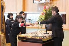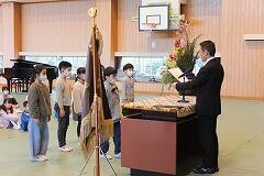 新任式では3名の先生方をお迎えし、始業式が行われました。式では児童を代表して5年生の上西ゆなさんが、新学期にがんばりたいこととして「思いやりの気持ちをもって友達にやさしくすること」「苦手なことにも挑戦して努力すること」について発表しました。