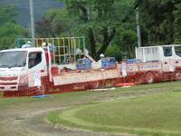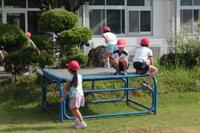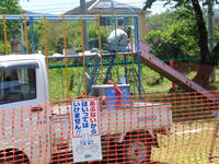 運動場の遊具に、以前行われた点検でけがにつながるような箇所が見つかり、使用できなかったのですが、業者の方が修理にこられました。初日は危険な部分を切断して取り除き、2日目は細かい部分を溶接して安全に使えるようにする作業でした。手を加えた部分には、新しいペンキが塗られ、作業が完了しました。