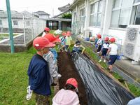 生活科の時間に1.2年生がさつまいもの苗植えをしました。植え方のご指導をしてくださるのは、地域の紺家さんです。毎年いも畑のマルチ張りから苗の植え方まで指導してくださっています。