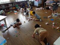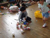 1.2年生が図工の学習をしていました。教室には、ペットボトルのキャップ、牛乳パックの空き箱がたくさん用意されています。学習の単元名は、「ならべてみつけて」です。子ども達は、数名ずつグループに分かれて、材料をならべたり、箱につめたり、集めて寄せたりして遊び始めました。積み木を重ねたり、ドミノ倒しのように並べたりして楽しく学習できました。