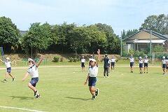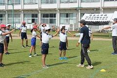 山之口地区小中一貫教育の取組として、本日は山之口中学校の先生から、走ることについて学習をしました。まず、ラジオ体操で準備運動を行い、フィールドの40m直線コースをスキップしながら走る活動から始まりました。次に、スキップの時のひざを高く上げ、大きく手を振りながら走る活動をしました。先ほどよりも脚の歩幅が広がり、ダイナミックに走っている姿に変化してきました。さらに、肩甲骨を柔らかくする動きとして、手の動きを「クロールの動き→背泳ぎの動き→右手はクロール、左手は背泳ぎ→反対の手の動き」という順番で走りながら行いました。後半は、頭で手の動きを考えていると足が動かなくなって立ち止まってしまう場面もありました。最後に仕上げとして、一定間隔のマーカーをリズムよくまたぎながら走る活動をしました。5・6年生は、はじめの頃よりもひざがよく上がり、大きなストライドで走る姿に変身していました。1時間の学習でしっかりと走る運動量を確保でき、自分の走りの変化に気付ける学習でした。特別授業をありがとうございました。