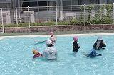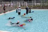 いつも通りの準備をしてシャワーを浴びましたが、体の水気を拭き取って服を着て集合しました。低学年は小プールで、中学年、高学年は大プールで行いました。担任の先生の指示で、服を着たまま水の中で動いたり泳いだりする活動を行い、泳ぎの大変さや疲れやすさに気付きました。その他、力をぬいてゆっくり泳ぐこと、浮かぶものにつかまって浮いておくこと、衣服は脱がずにそのままでいることなどについても学習しました。